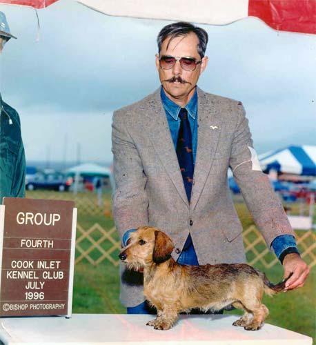 This is CH "Ruffy" at one of his first shows, the Dachshund Club of Santa Ana Valley Specialty Show in April of 2006. He was awarded Best Puppy in Sweepstakes (Wirehaired Variety) by Judge Hal T. Biermann. Ruffy quickly finished his Championship and went on to place in the Group.